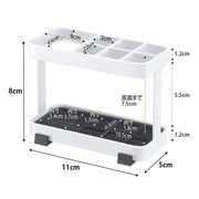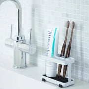 歯ブラシ6本、歯磨き粉1本収納可能。剃刀や歯間ブラシも収納可能。マットは取り外しが可能でお手入れも簡単。設置面を汚さないクッションつき。